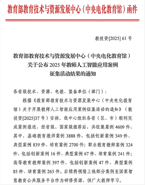 近年来,学校始终关注人工智能等新技术与教育教学的融合创新,大力支持教师开展教学改革探索,逐步形成了一批具有示范意义的优质教学成果。此次入选,体现了教育部对我校在深化教学改革、推动教育数字化转型升级方面工作的认可。下一步,学校将继续搭建AI技术与教学实践深度融合的交流平台,推广优质教学案例,助力广大教师提升人工智能应用能力,不断优化人才培养体系,为学校教育教学高质量发展注入新动力。