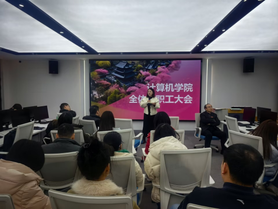 为全面谋划2026年学院各项工作,明确发展目标与重点任务,凝聚全体教职工奋进力量,2026年3月4日下午,计算机学院在实2-308召开2026年新学期全体教职工大会。院长黄传河主持会议并作动员讲话,学院全体教职工参会。
